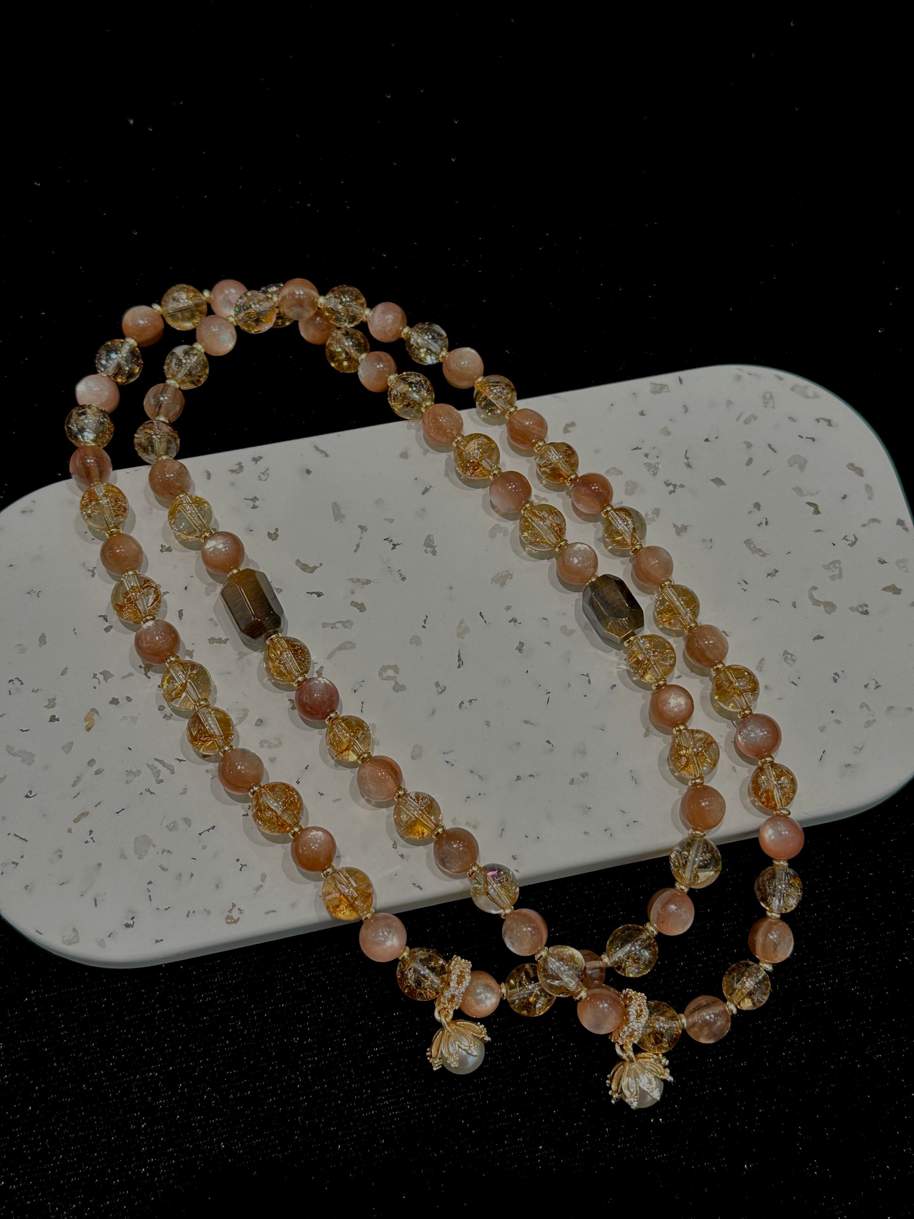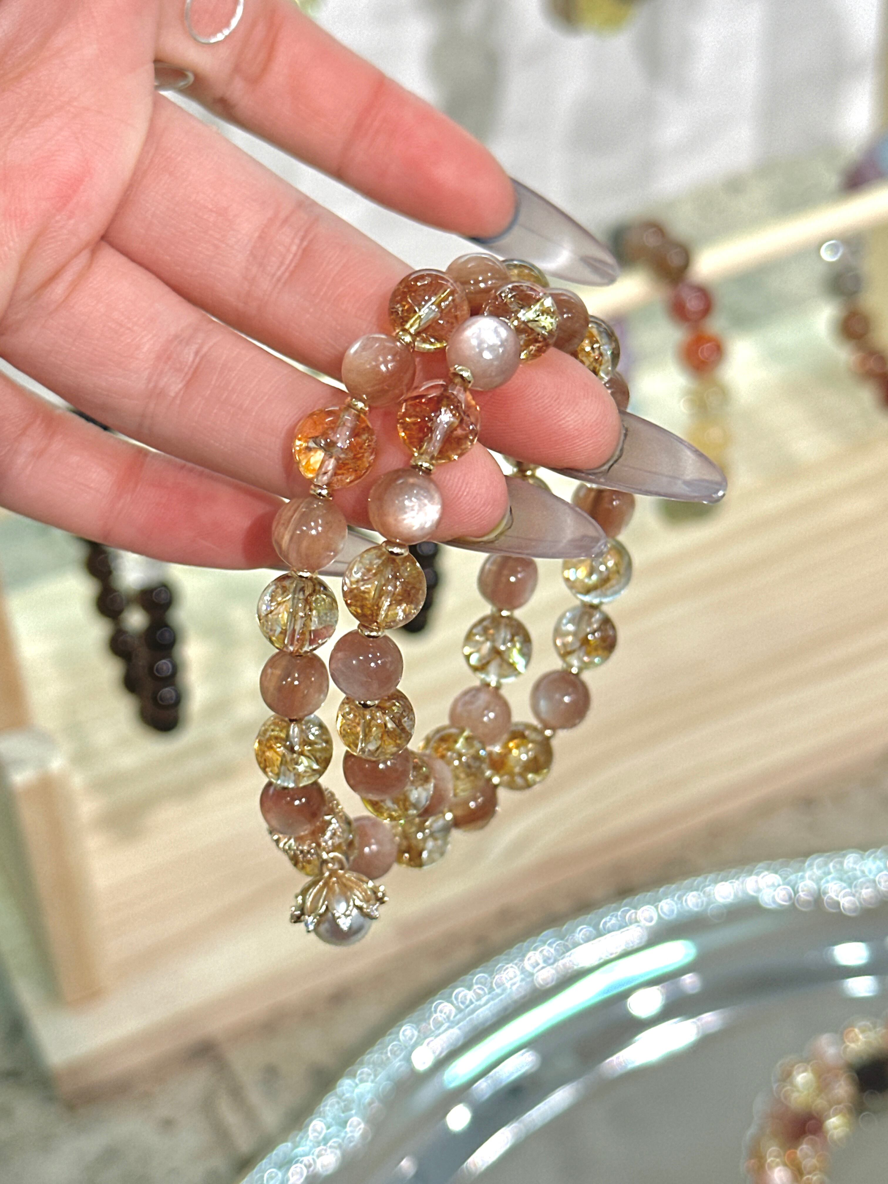 黄金色の輝きを持つ天然石を中心に、琥珀色やクリアな石を調和よく配し、