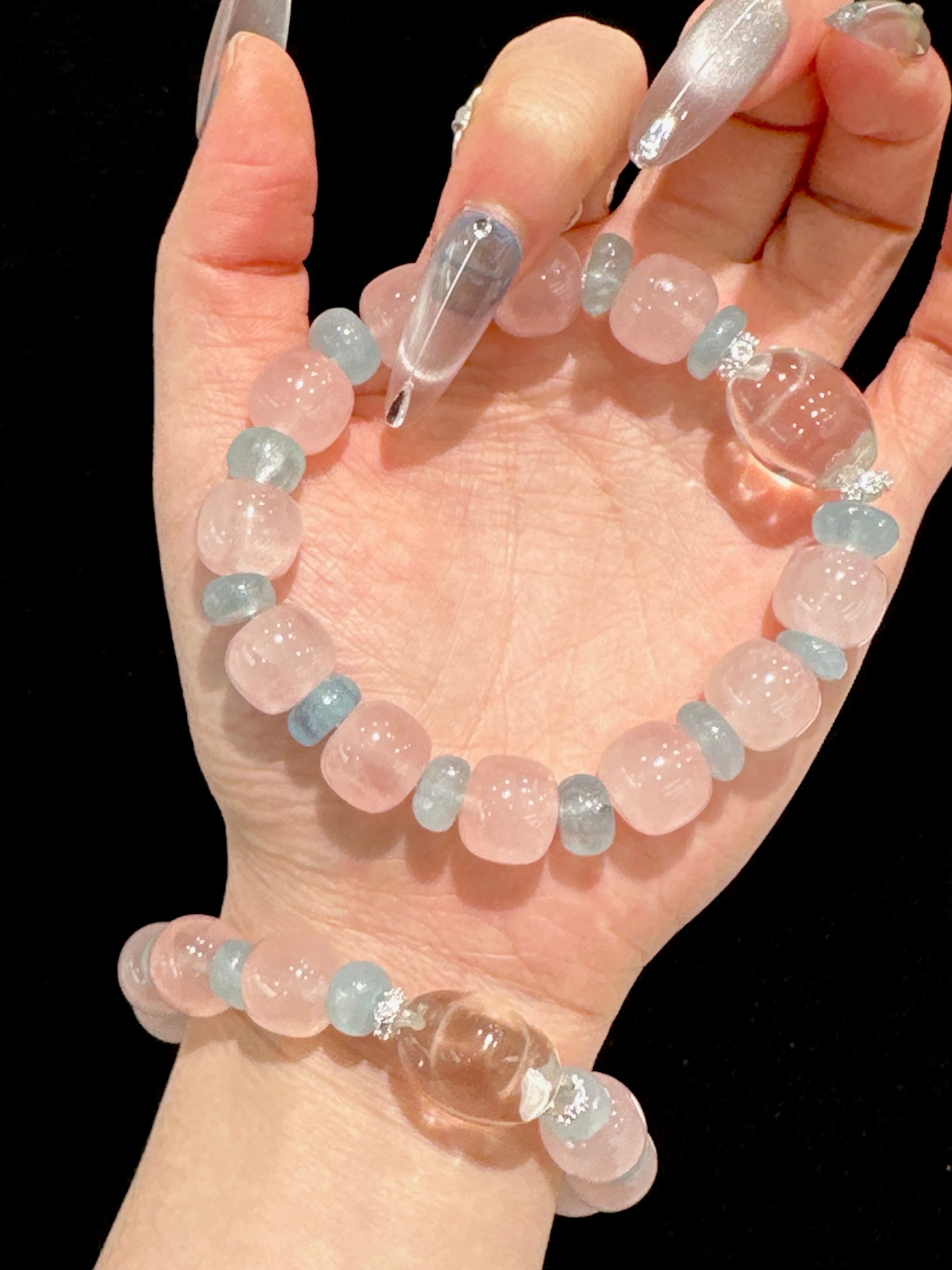 淡いピンクのローズクォーツを主役に、清らかなブルーのアクアマリンとクリアなクリスタルを調和よく配し、