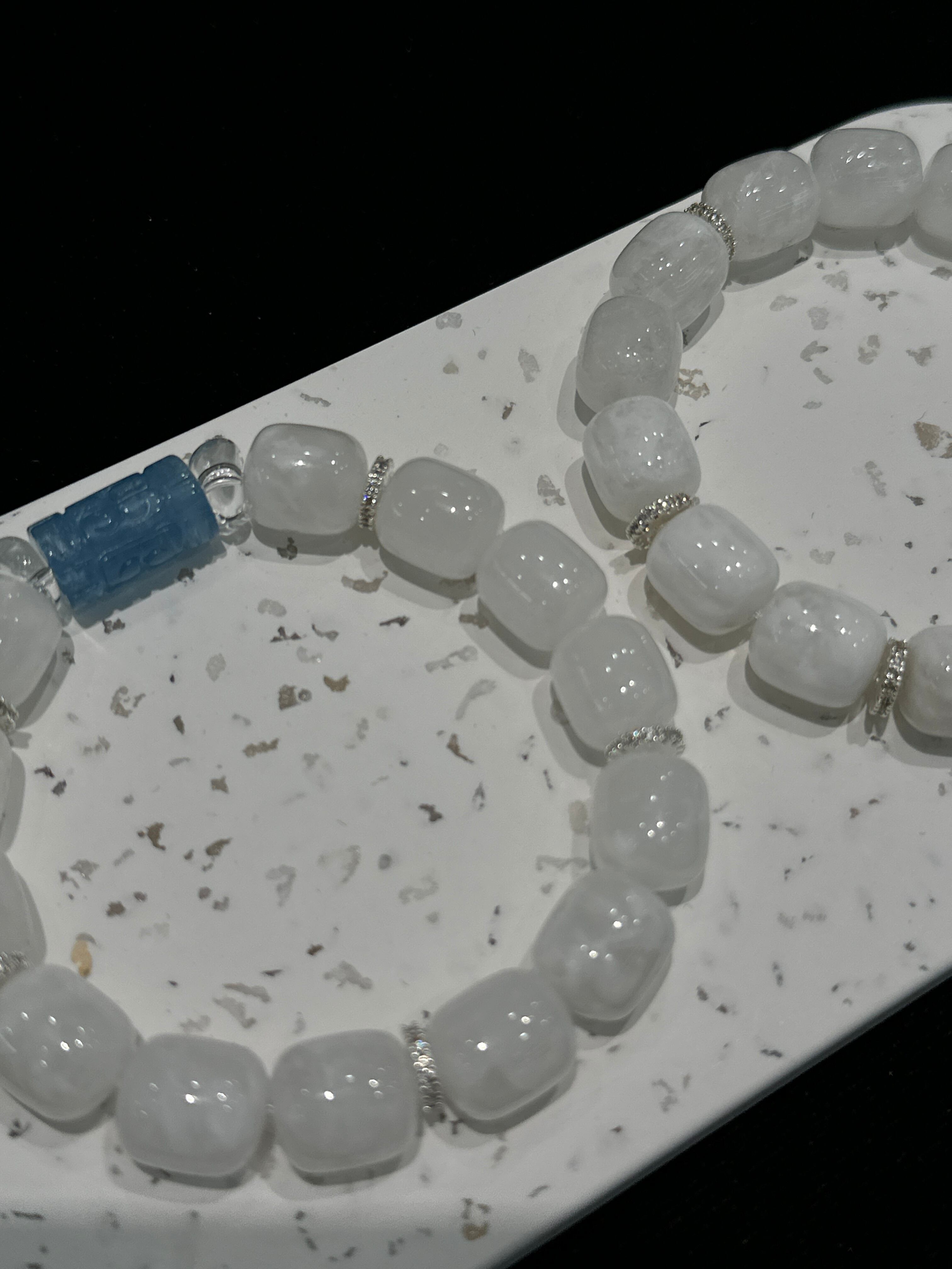 乳白色の天然石を主役に、深いブルーの彫刻ビーズをアクセントとして配し、