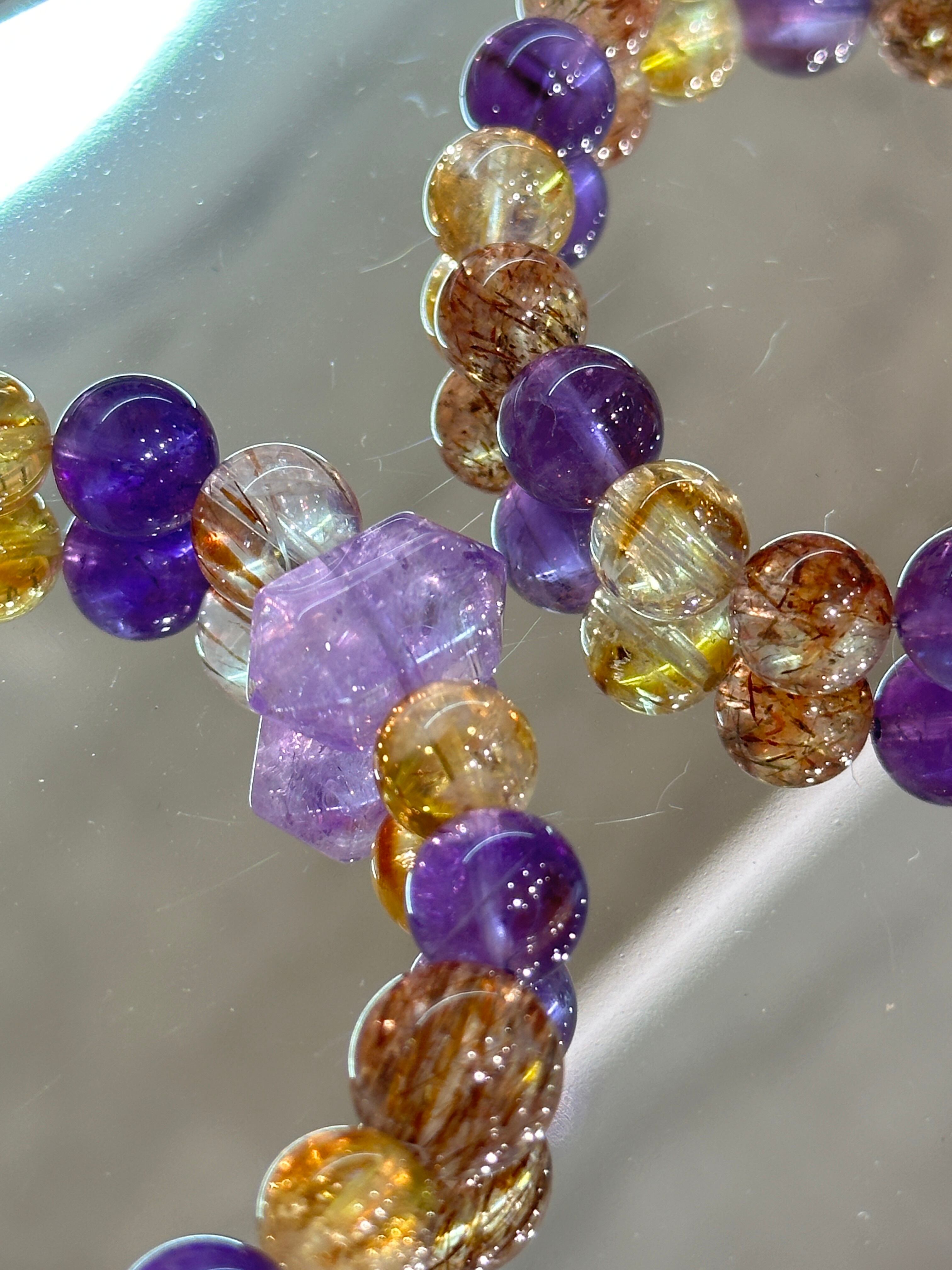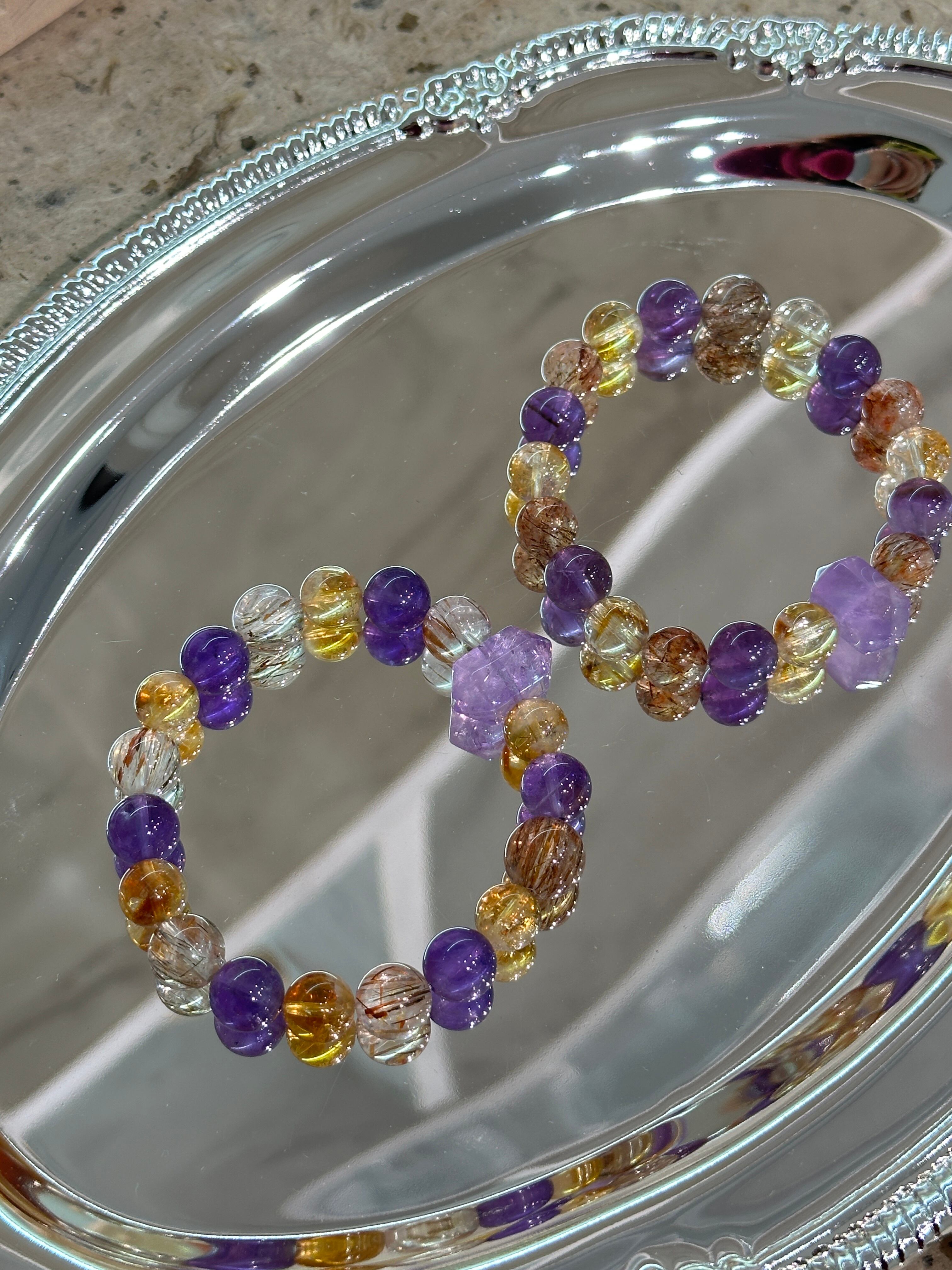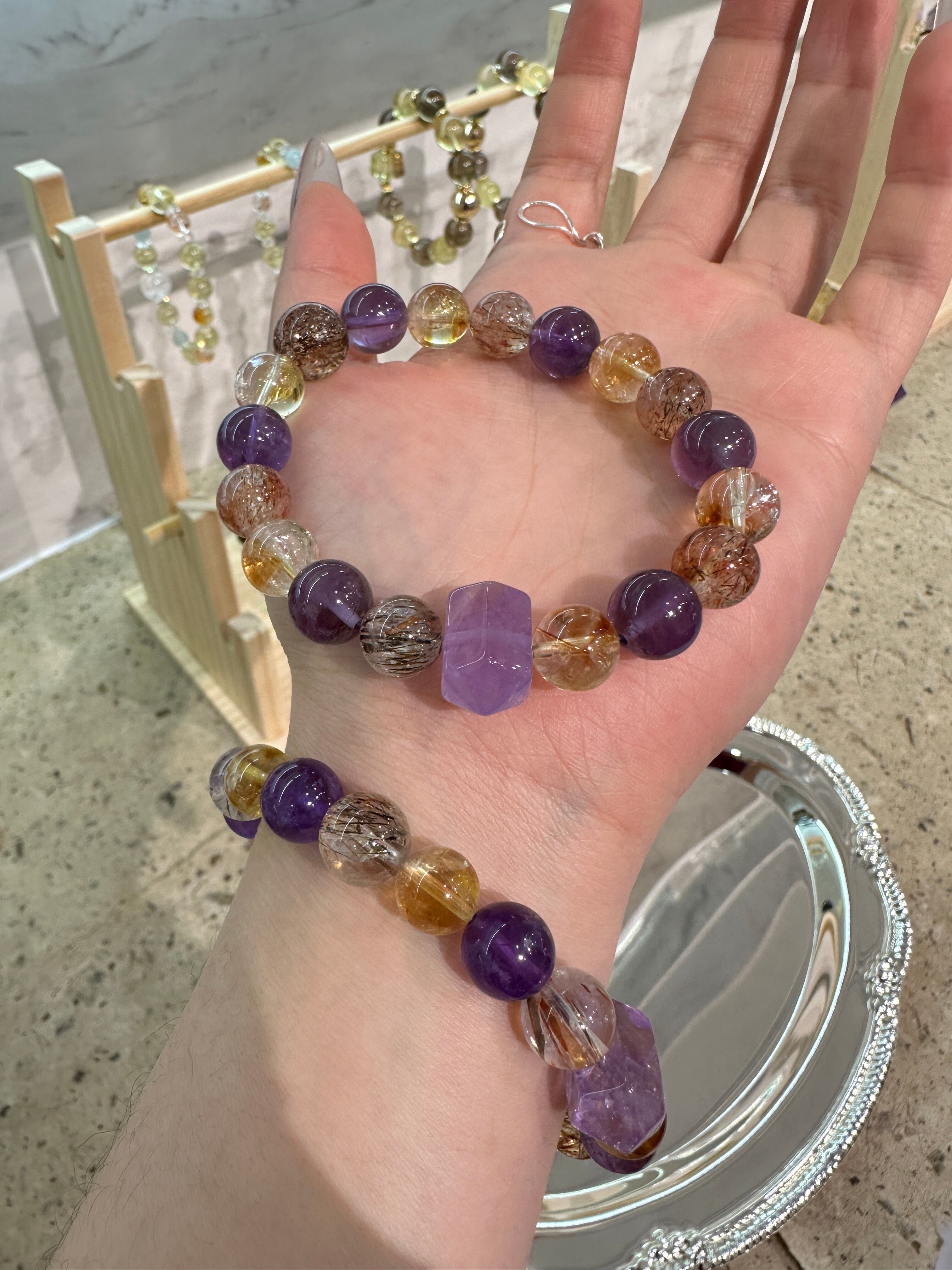 神秘的な紫の石を中心に、輝く黄系と透明感のあるクリスタルを調和よく配し、