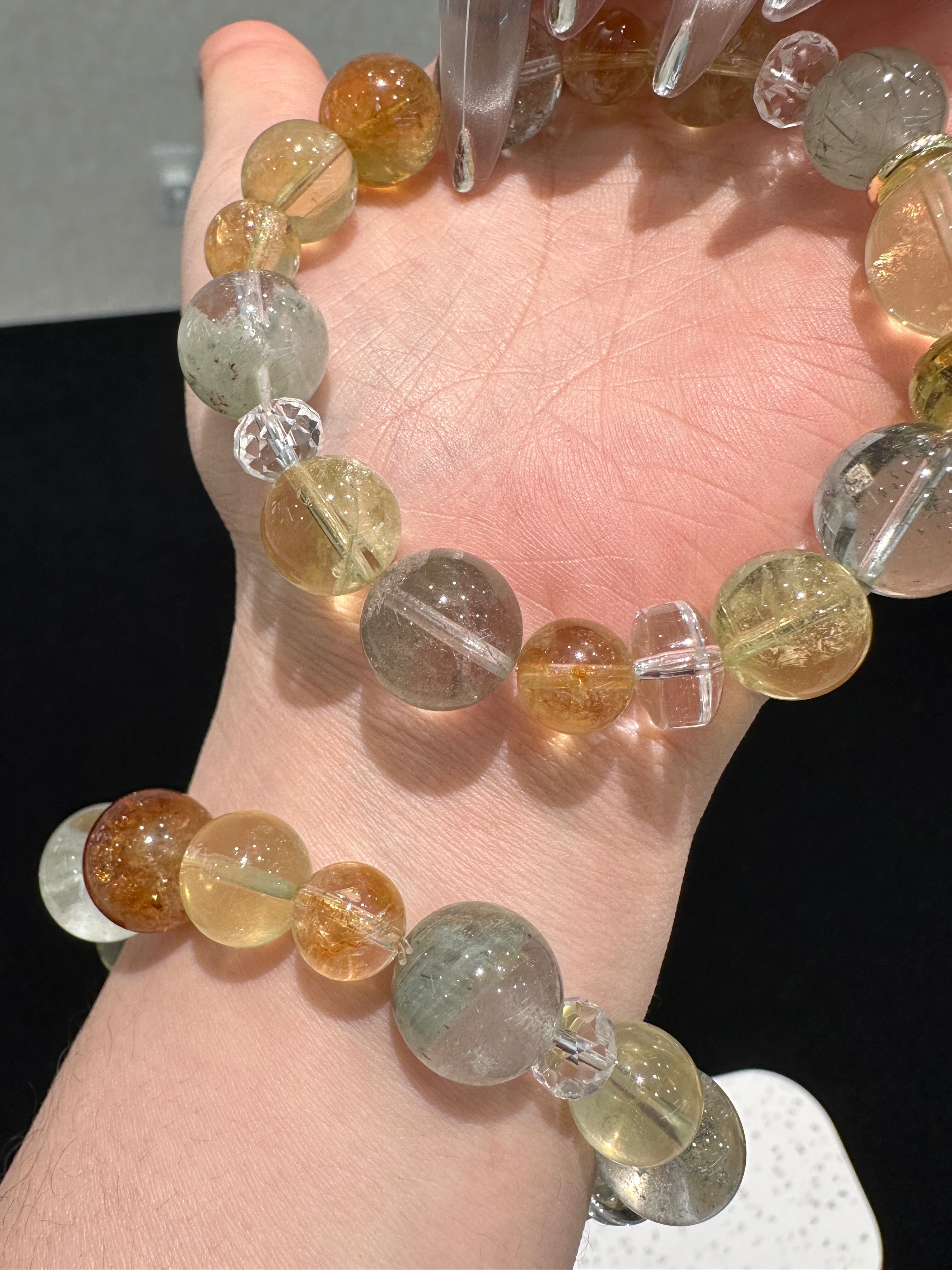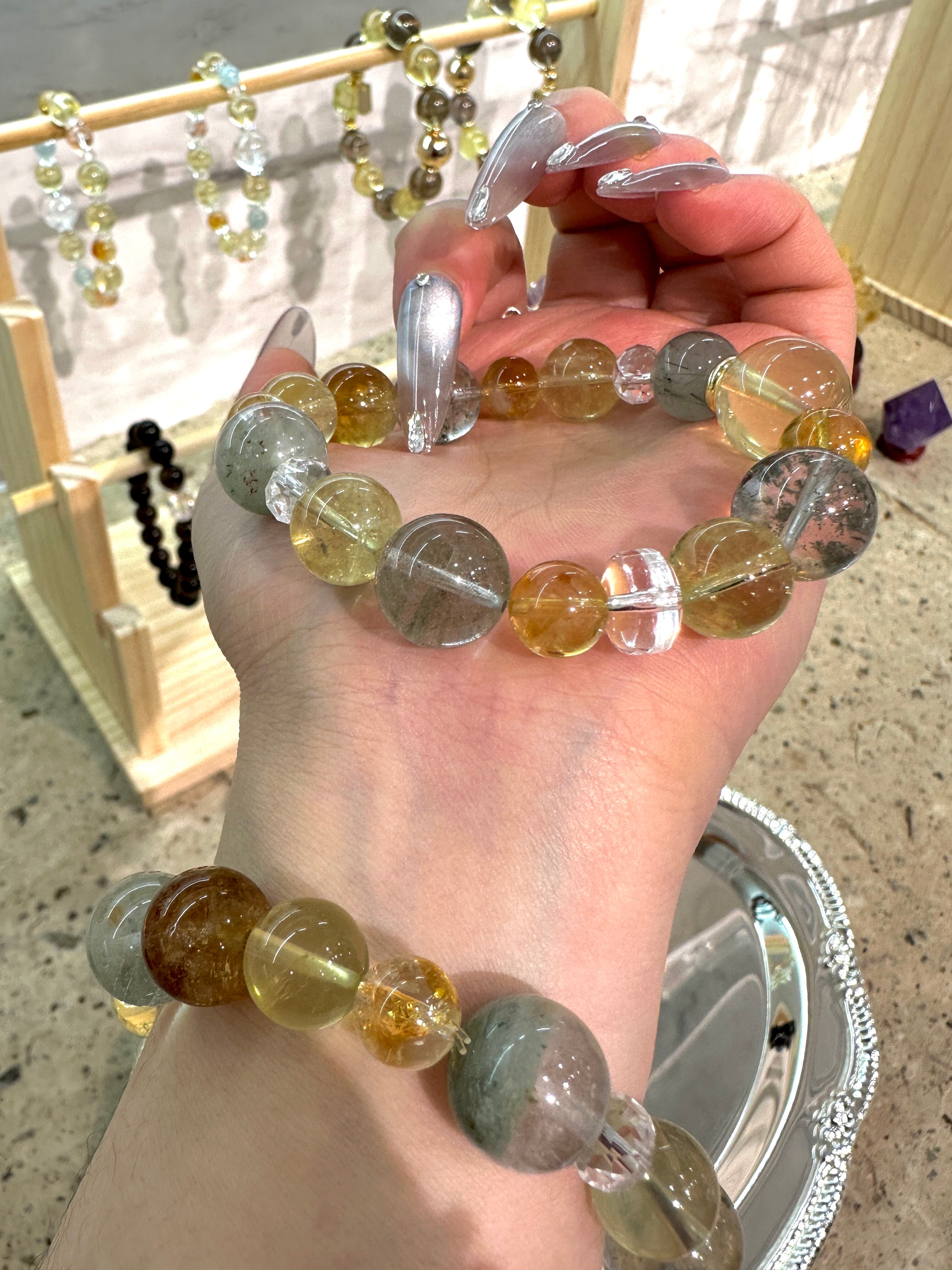 琥珀色の黄系の石、深みのあるグリーン系の石、そしてクリアなクリスタルを調和よく配し、