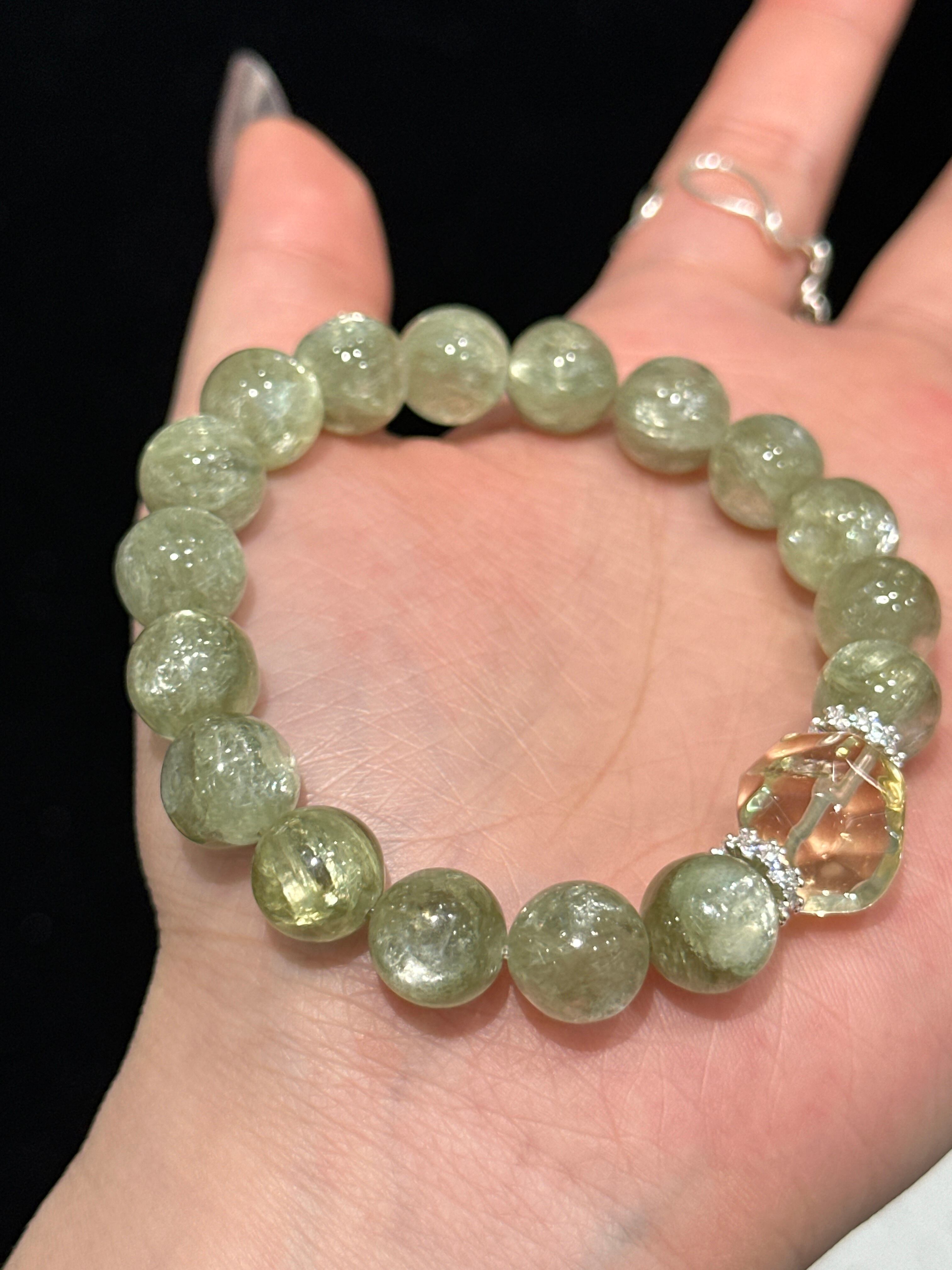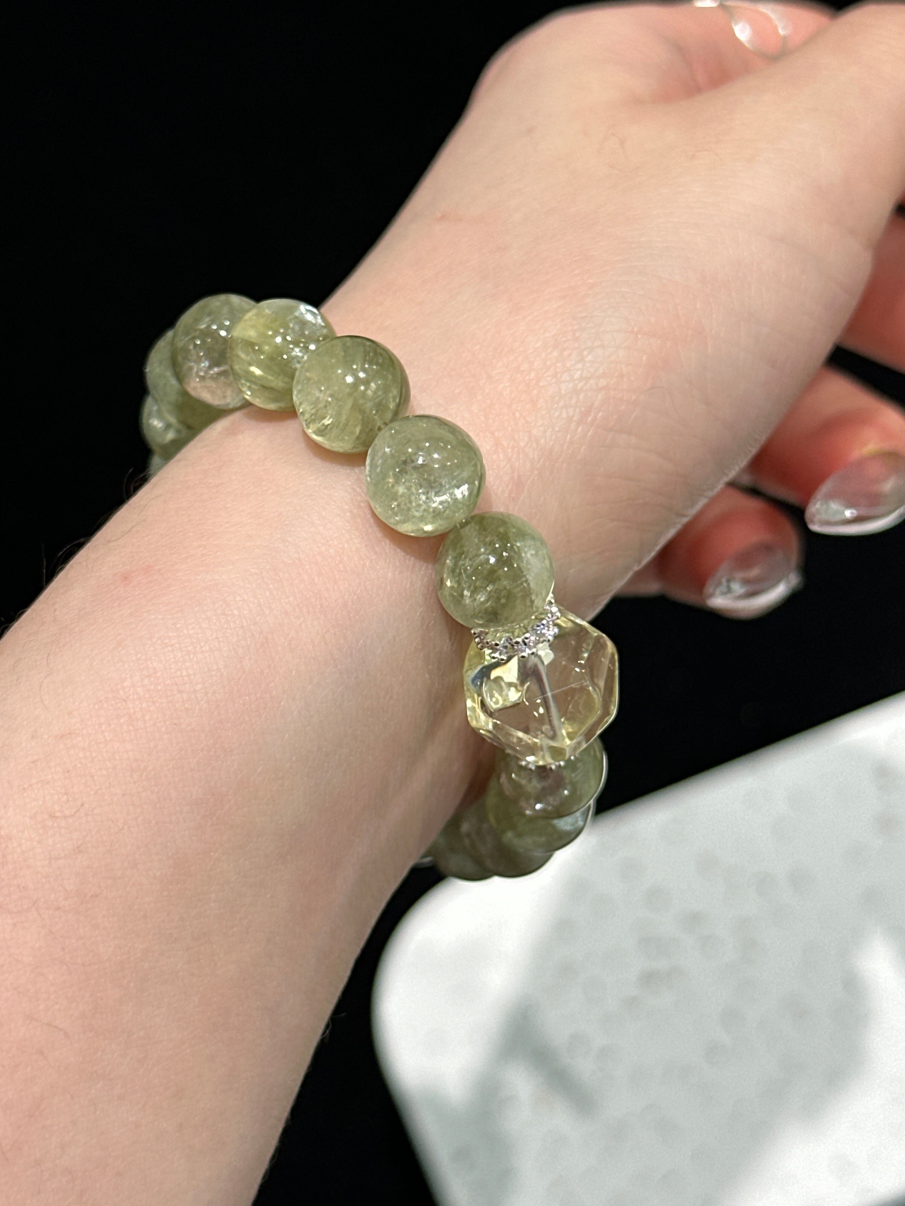 清々しい緑系の石を主役に、輝くクリアなクリスタルをセンターに配し、