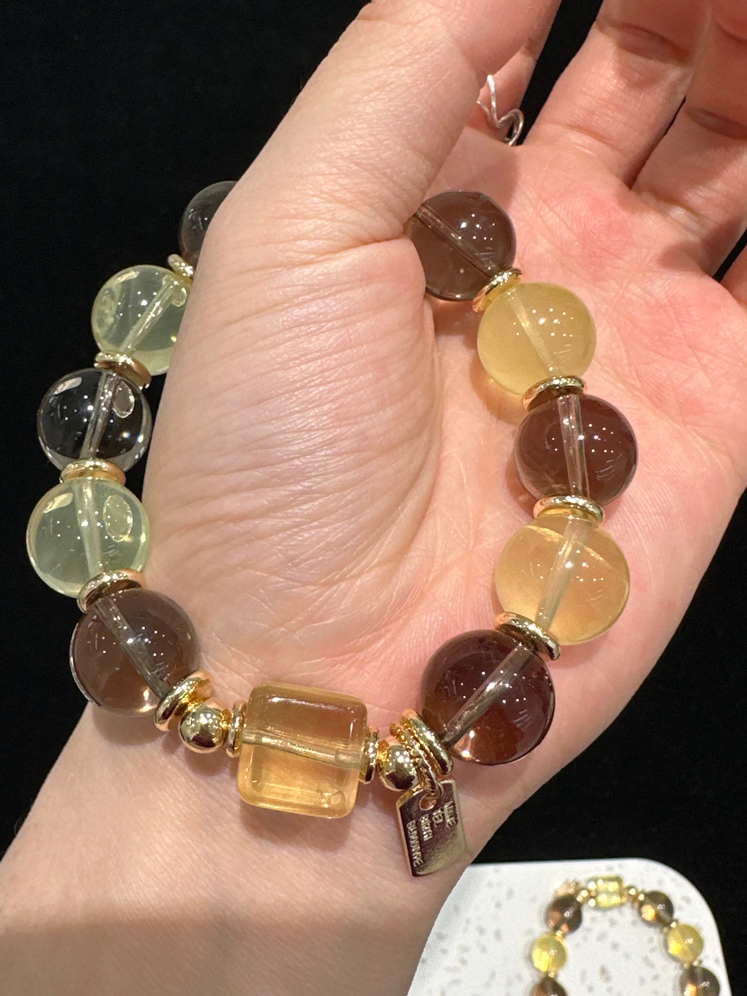 琥珀色の黄系の石、深みのある茶系の石、そしてクリアなクリスタルを調和よく配し、