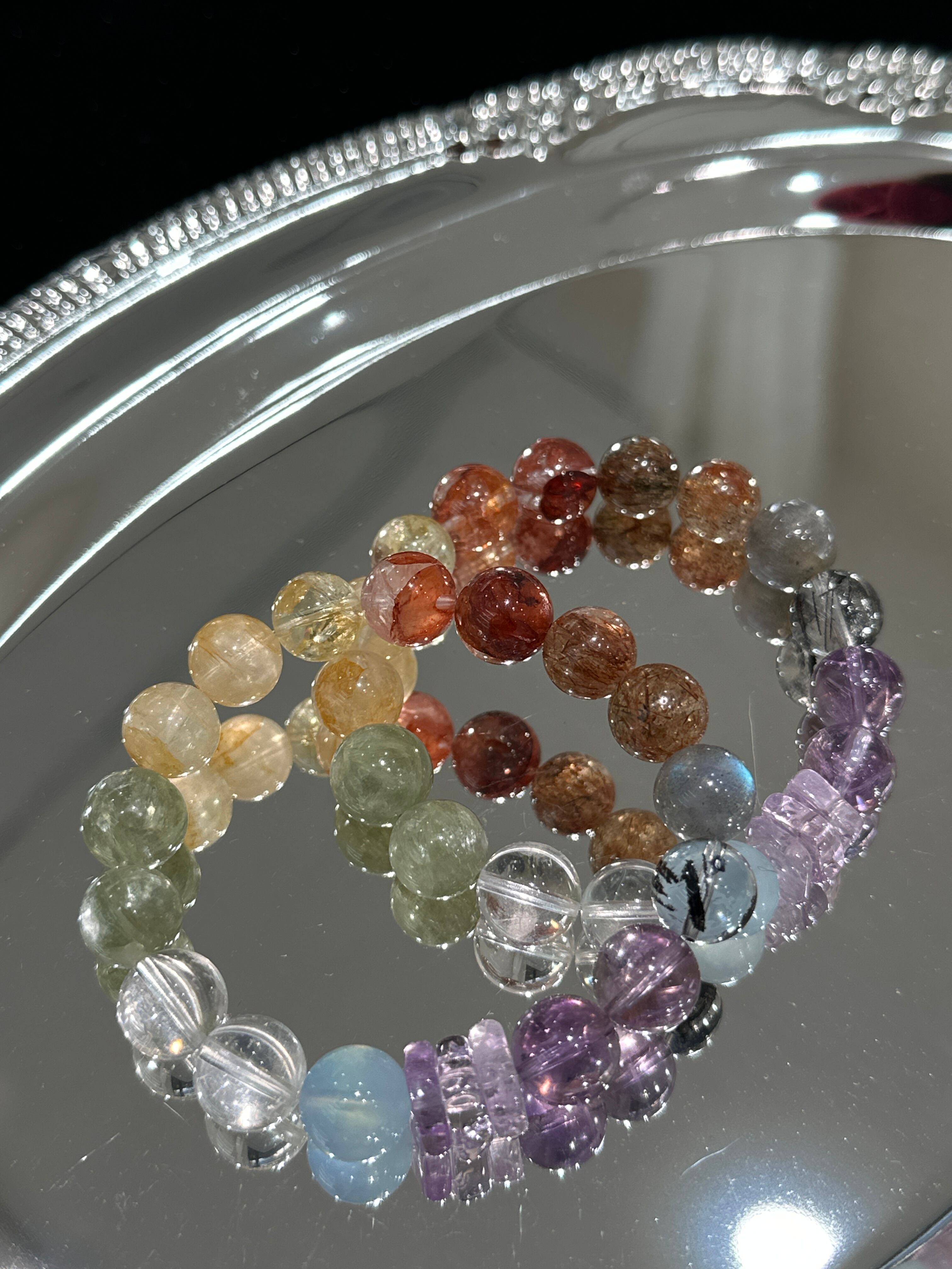赤、橙、黄、緑、青、紫、クリアなどの多彩な石を一つの輪に連ね、