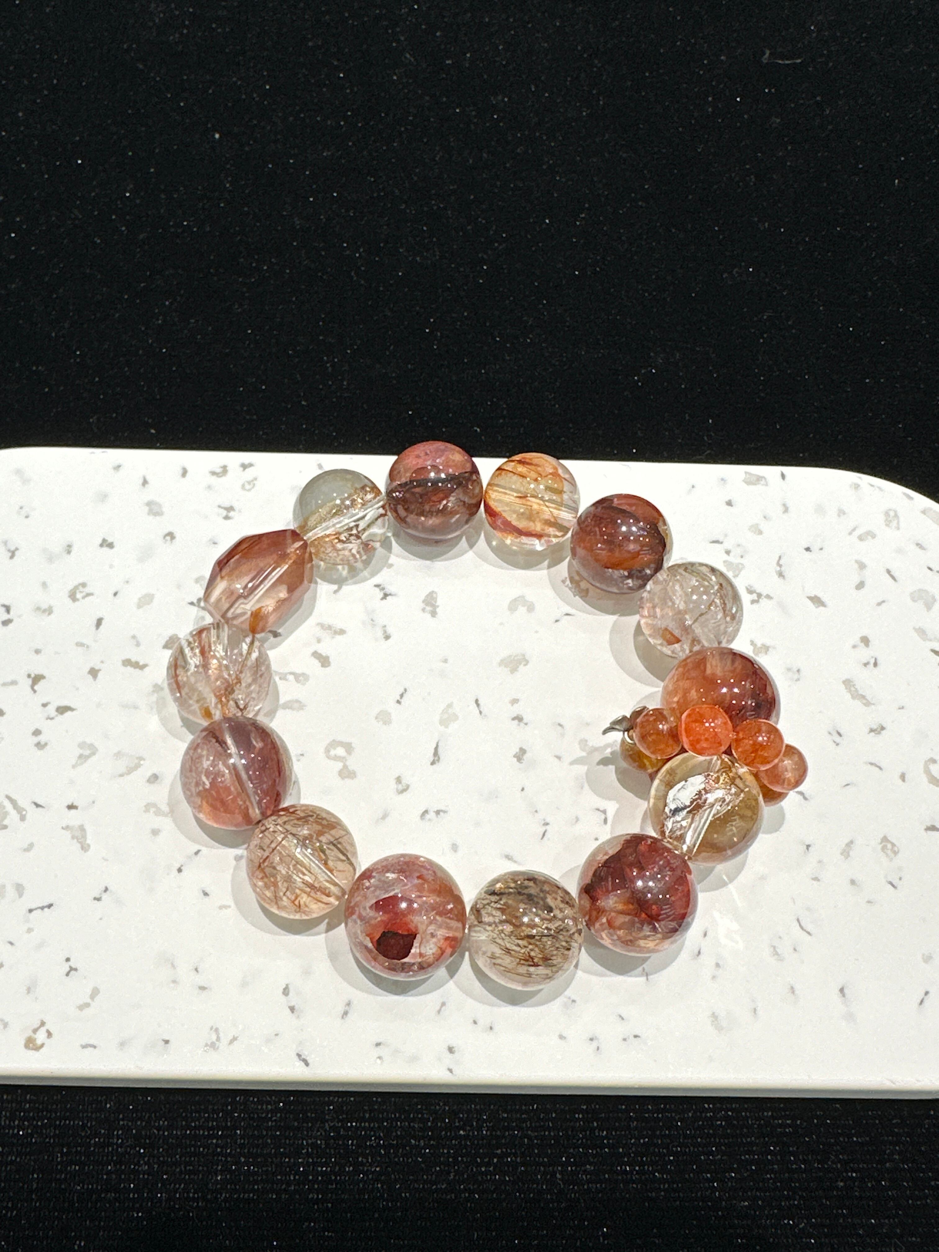 琥珀色の赤系の石、透明感のあるクリスタルを調和よく配し、