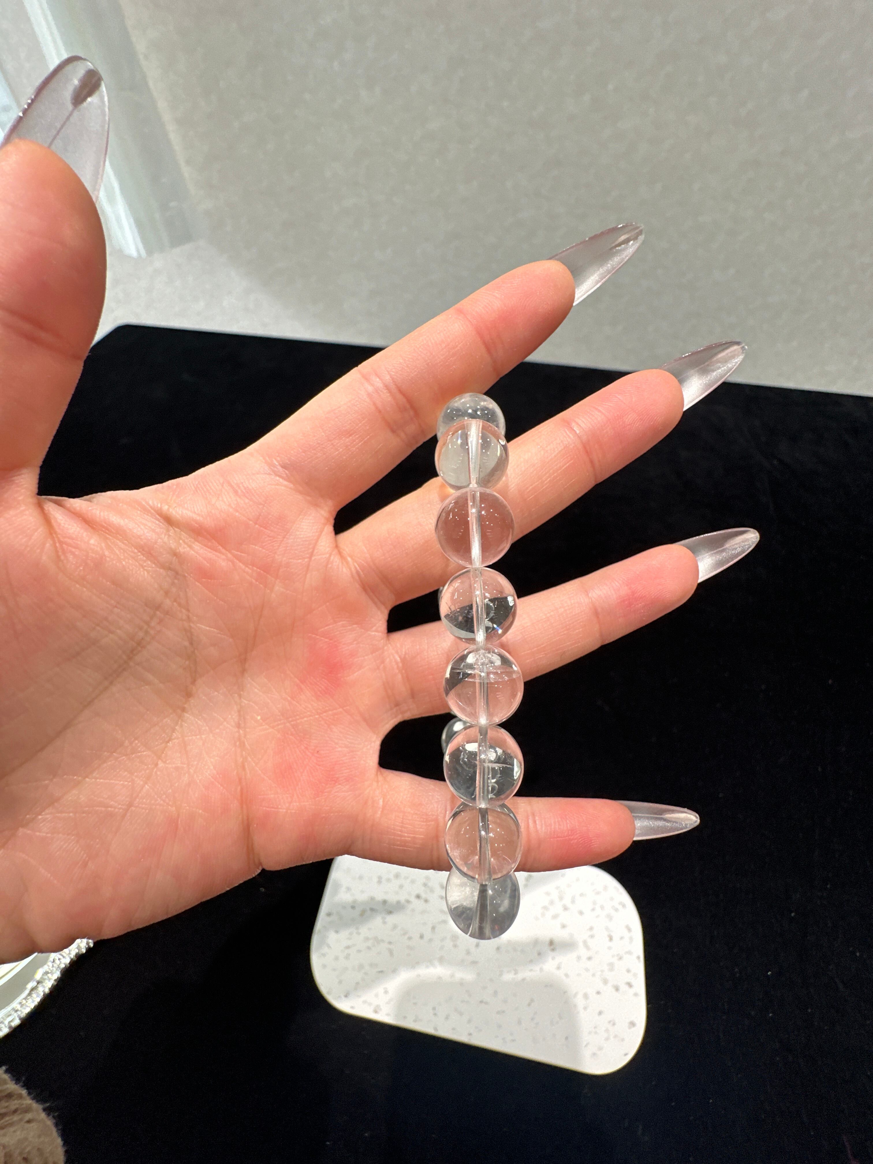 このブレスレットは、** 高品質な白水晶(クリアクォーツ)** の丸玉を使用したシンプルなデザインです。