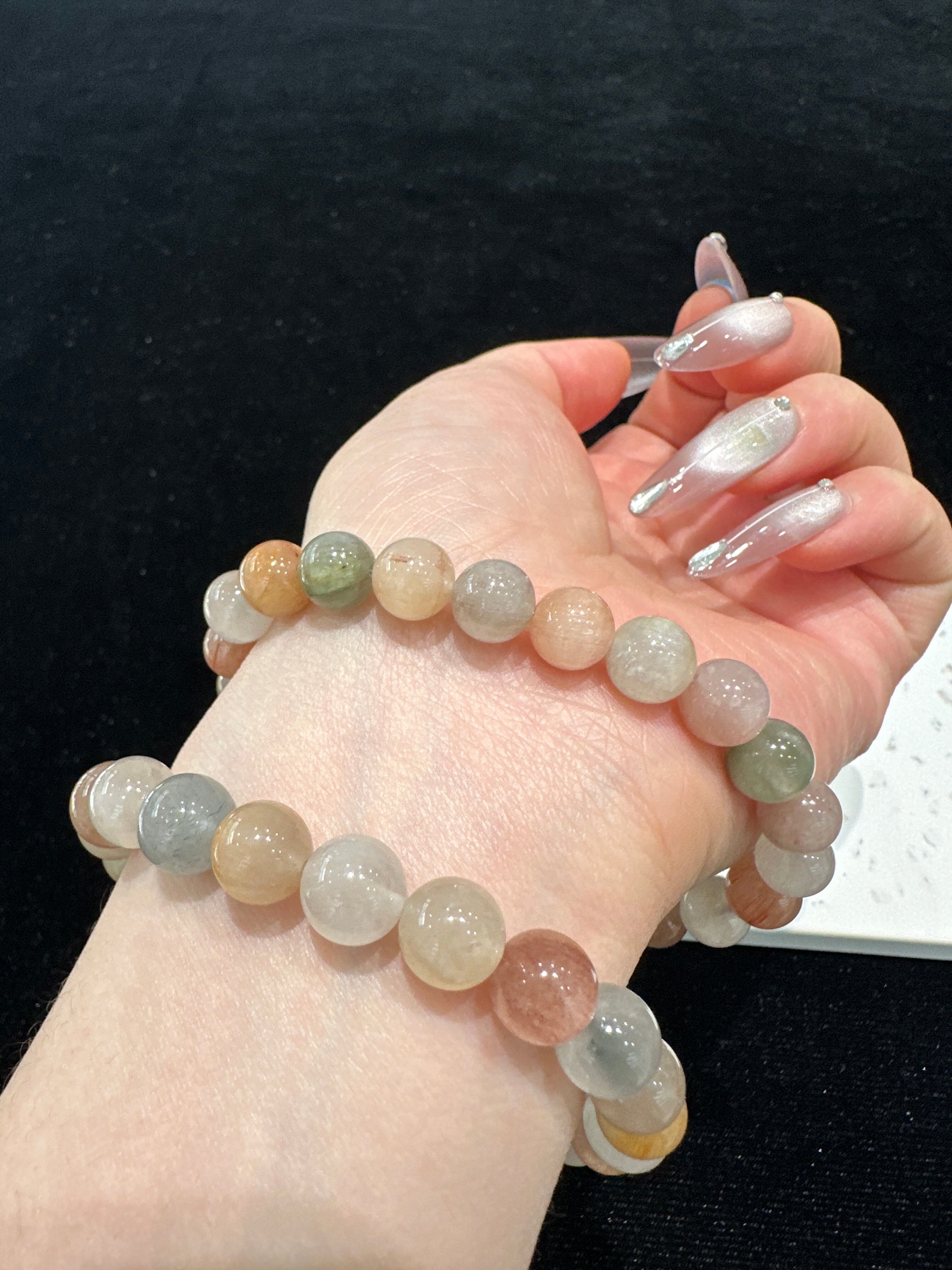 このブレスレットは、** 高品質なマルチムーンストーン(多色月光石)** の丸玉を使用したシンプルなデザインです。