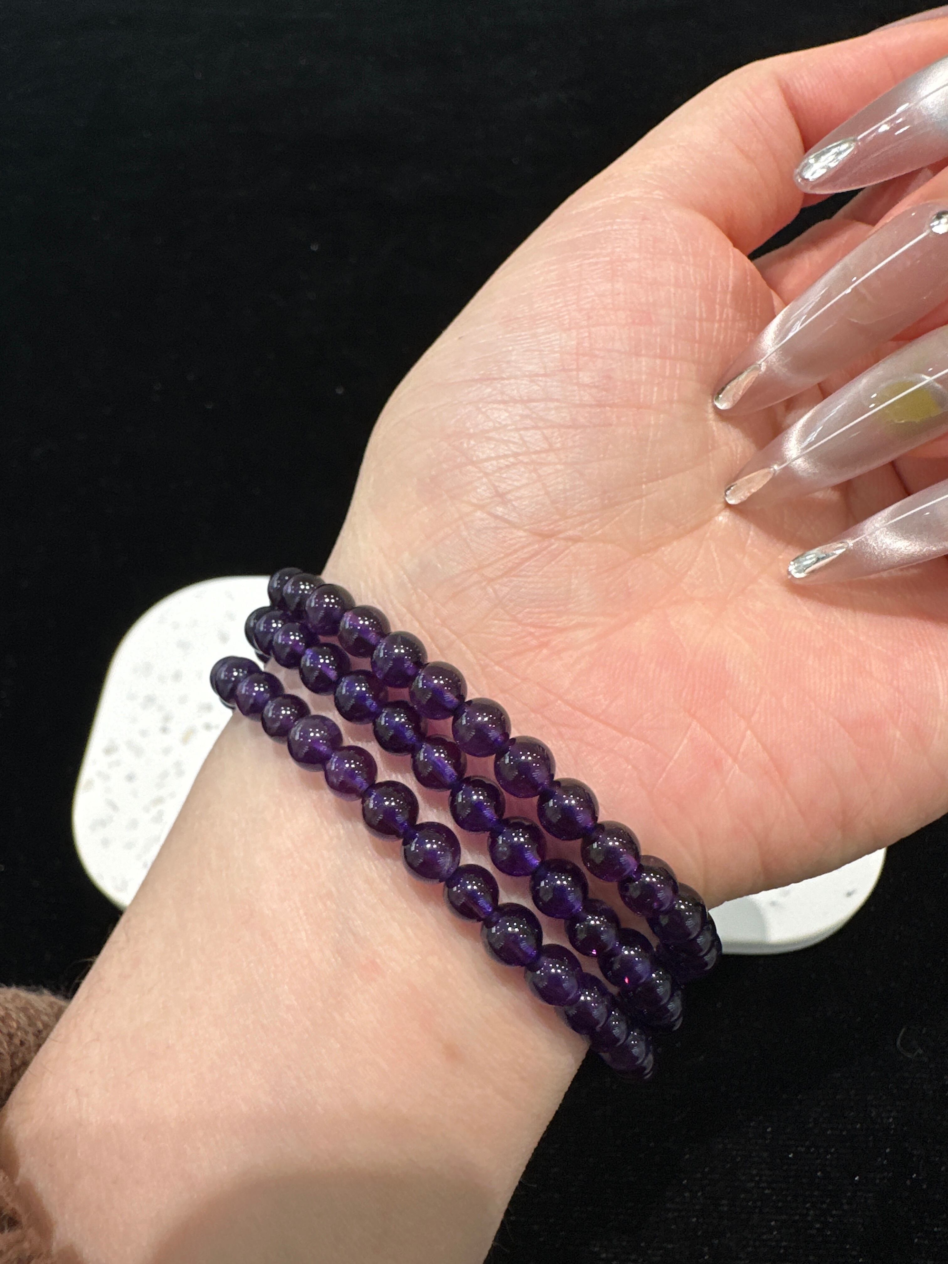 このブレスレットは、** 高品質なアメジスト(紫水晶)** の丸玉を使用したシンプルなデザインです。