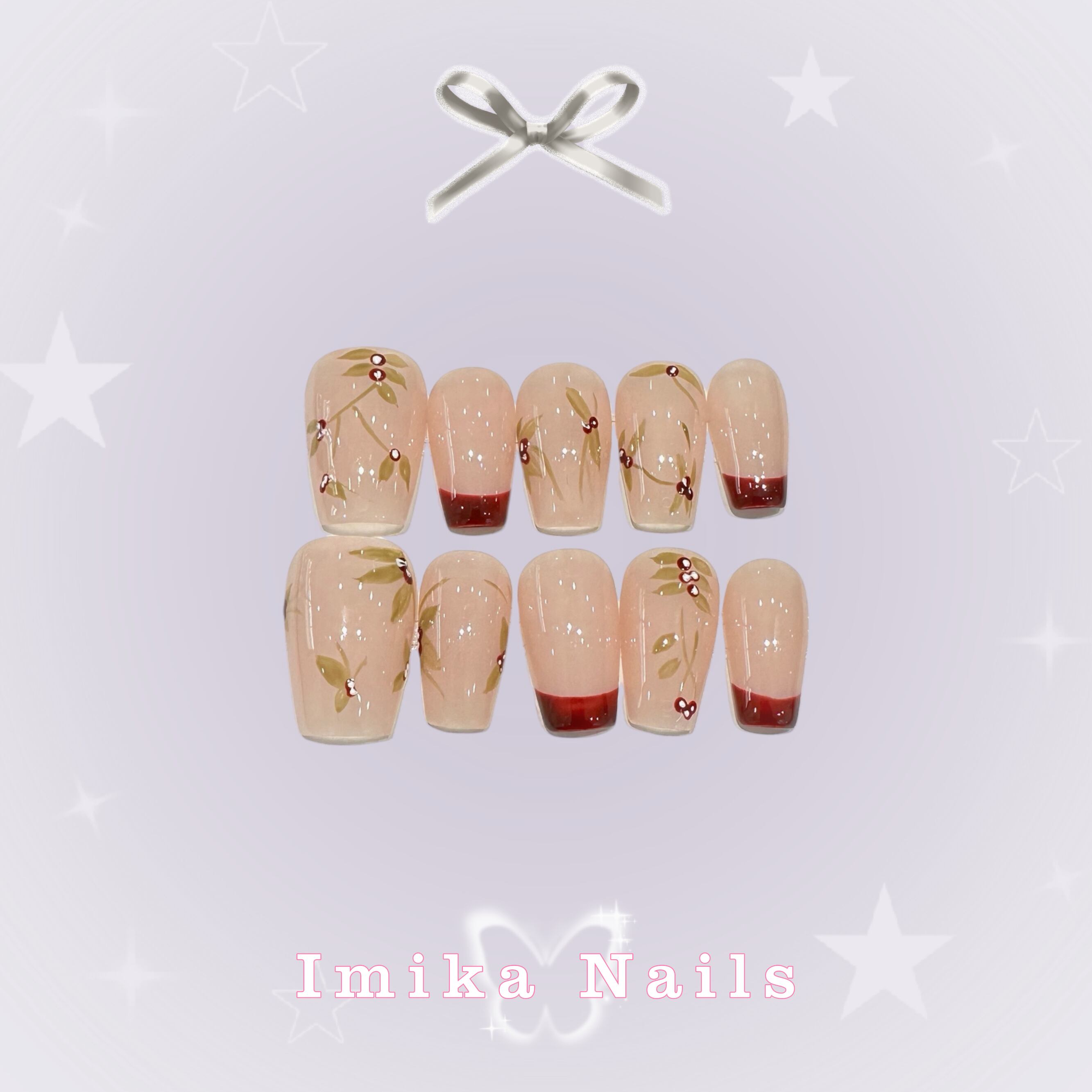 ヌードベースにワインレッドのフレンチライン、手描きの赤い実と枝葉の模様が東洋の雅やかな雰囲気を再現。日常通勤でも優しい気品を演出し、XS,S,M サイズのミディアム丈が美しさと実用性を両立します。