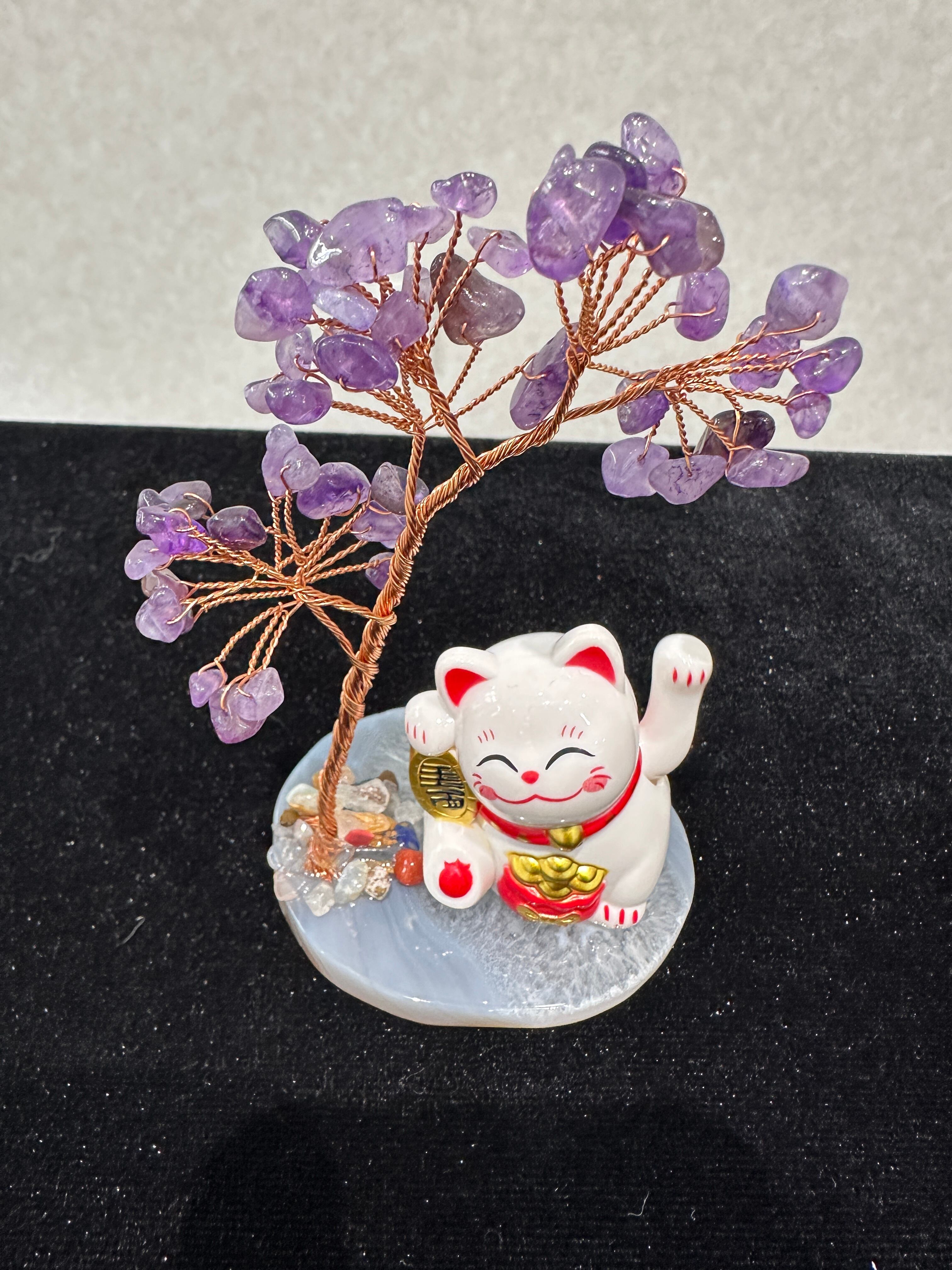 素材:アメジスト(葉)、天然水晶さざれ石(台座装飾)、銅線(枝幹)、招き猫オブジェ