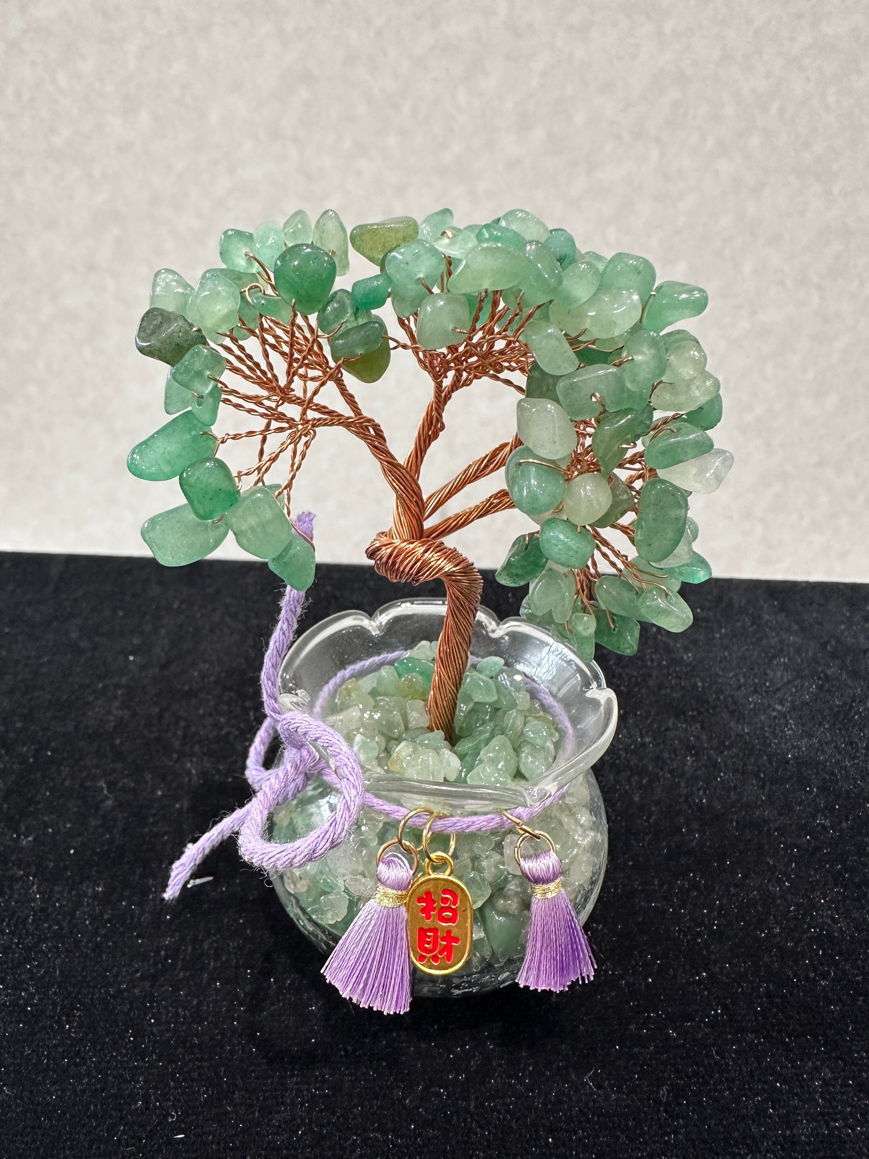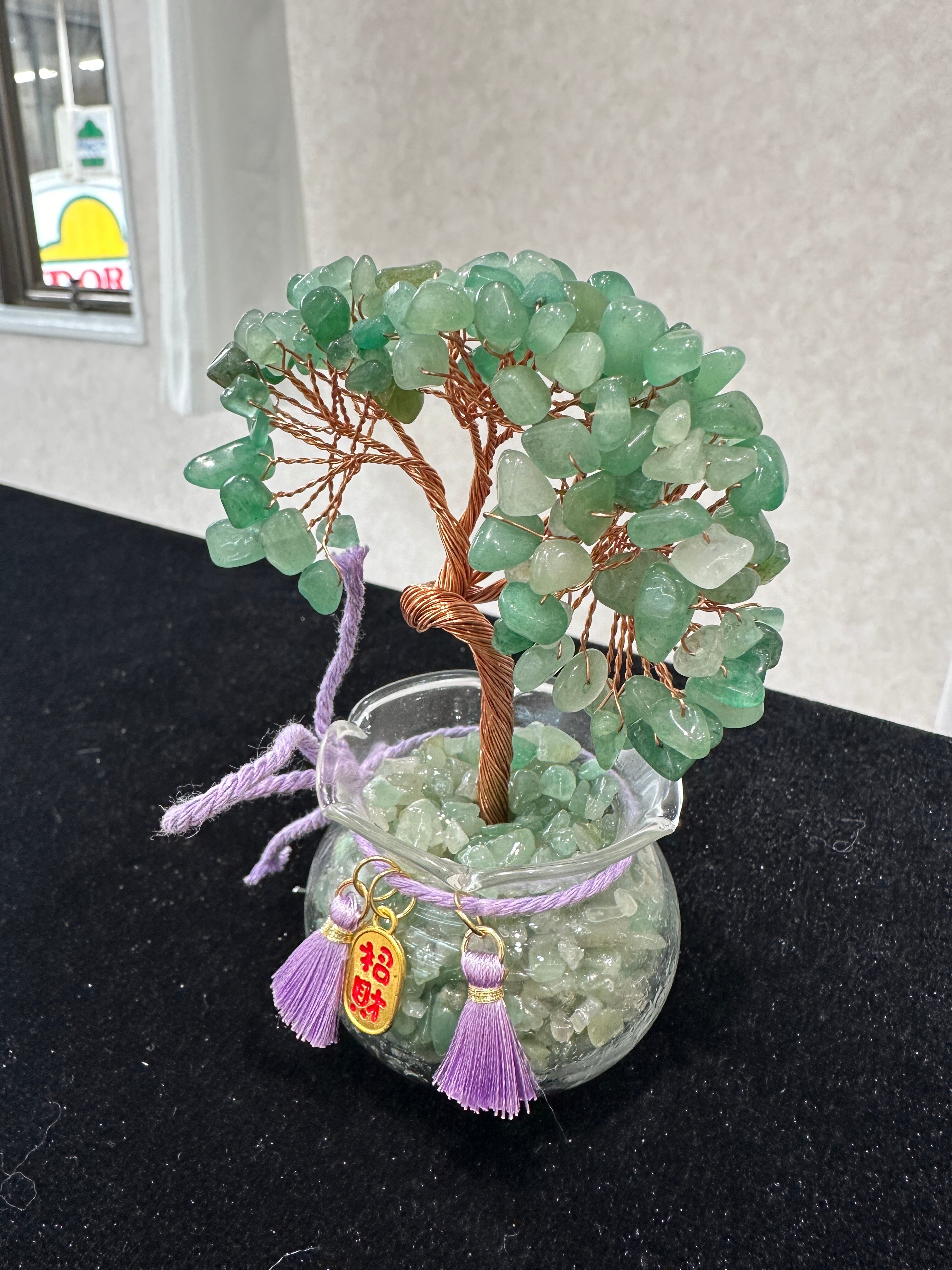 素材:グリーンアベンチュリン(葉)、グリーンアベンチュリンさざれ石(台座)、銅線(枝幹)、ガラス鉢、福財チャーム