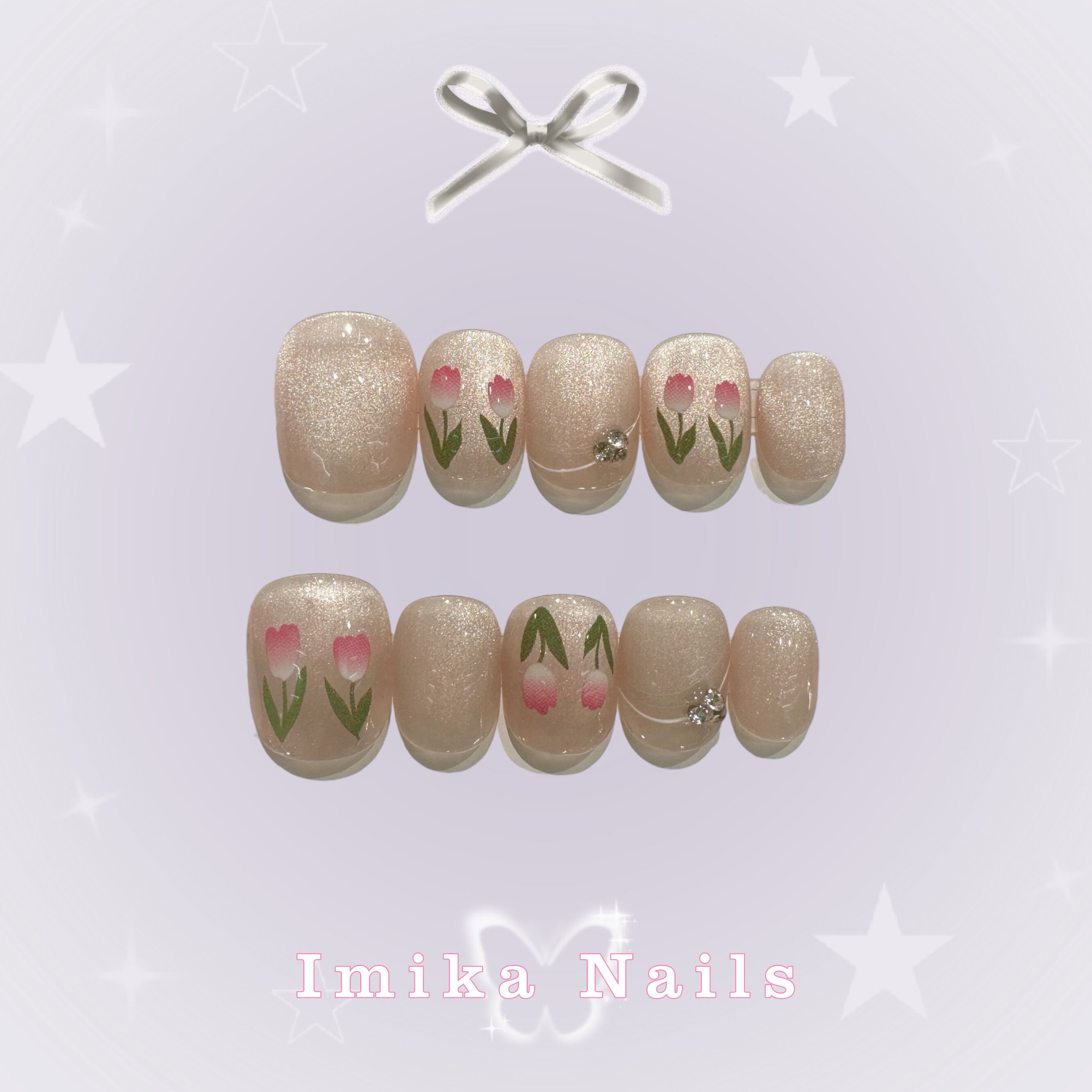ヌードピンクグラデーションをベースに、手描きのチューリップと小さなストーンをアクセント。優しく清々しい雰囲気を纏い、XS/S/M サイズ対応で春夏コーデに最適です。