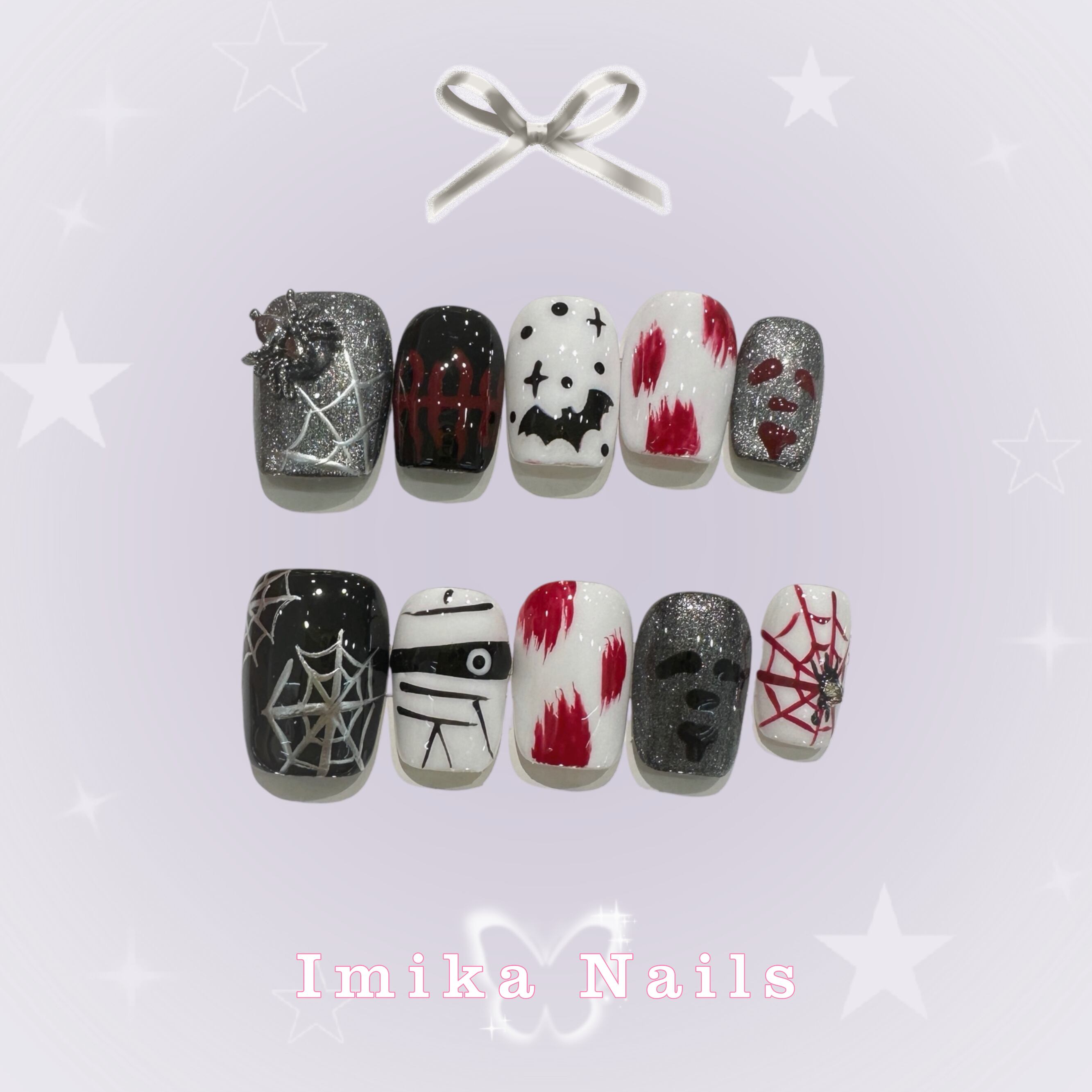 ブラックとホワイトのコントラストに、手描きの蜘蛛、蝙蝠、包帯、血痕をアクセント。ハロウィンのダークな雰囲気を纏い、XS/S/M サイズ展開で個性的なコーデやパーティーに最適です。
