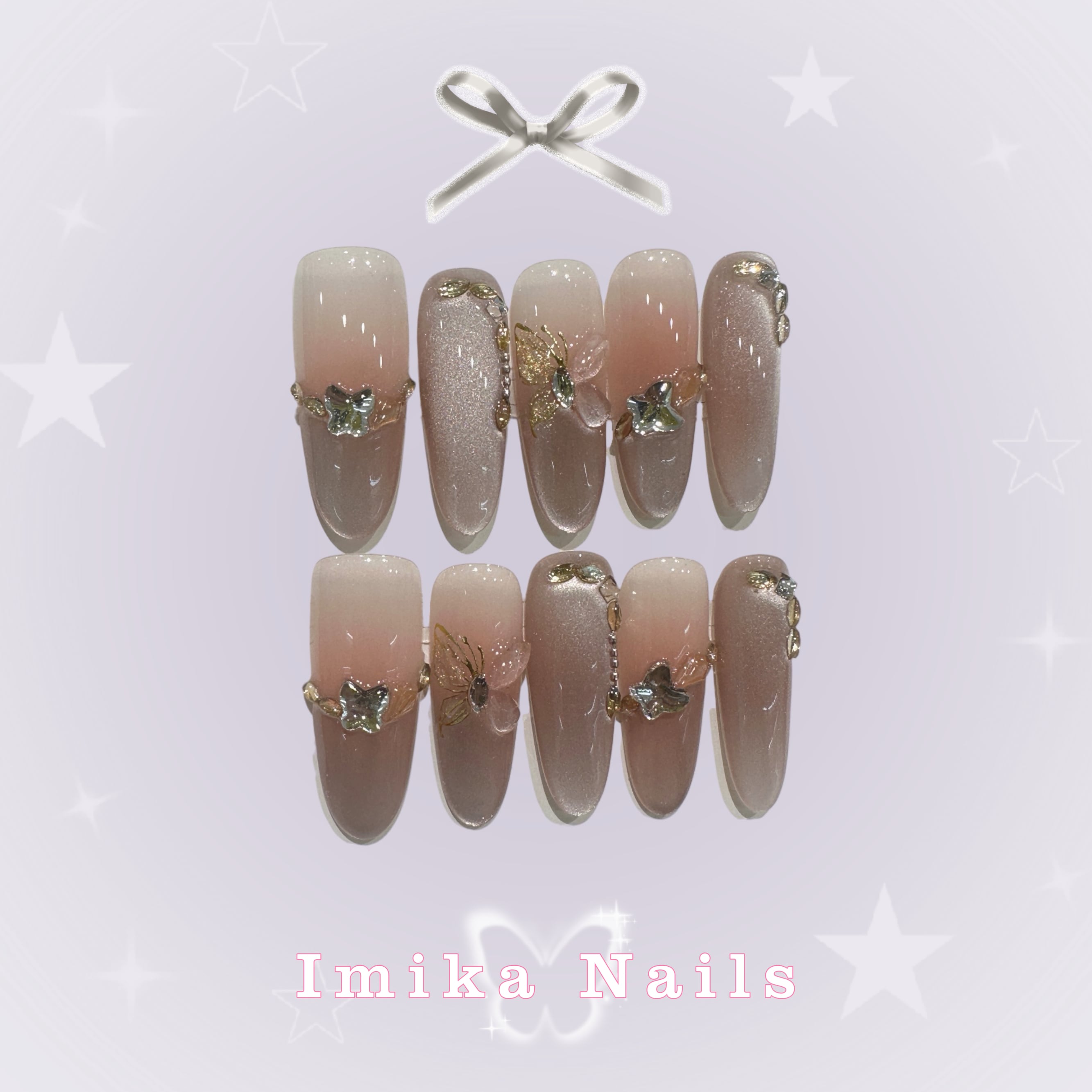 ピンクブラウンのグラデーションをベースに、立体的なシルバーの蝶、ゴールドの蝶、シルバーアクセサリーをアクセント。東洋の雅やかさと高級感を演出し、XS/S/M サイズ対応で日常通勤に最適です。