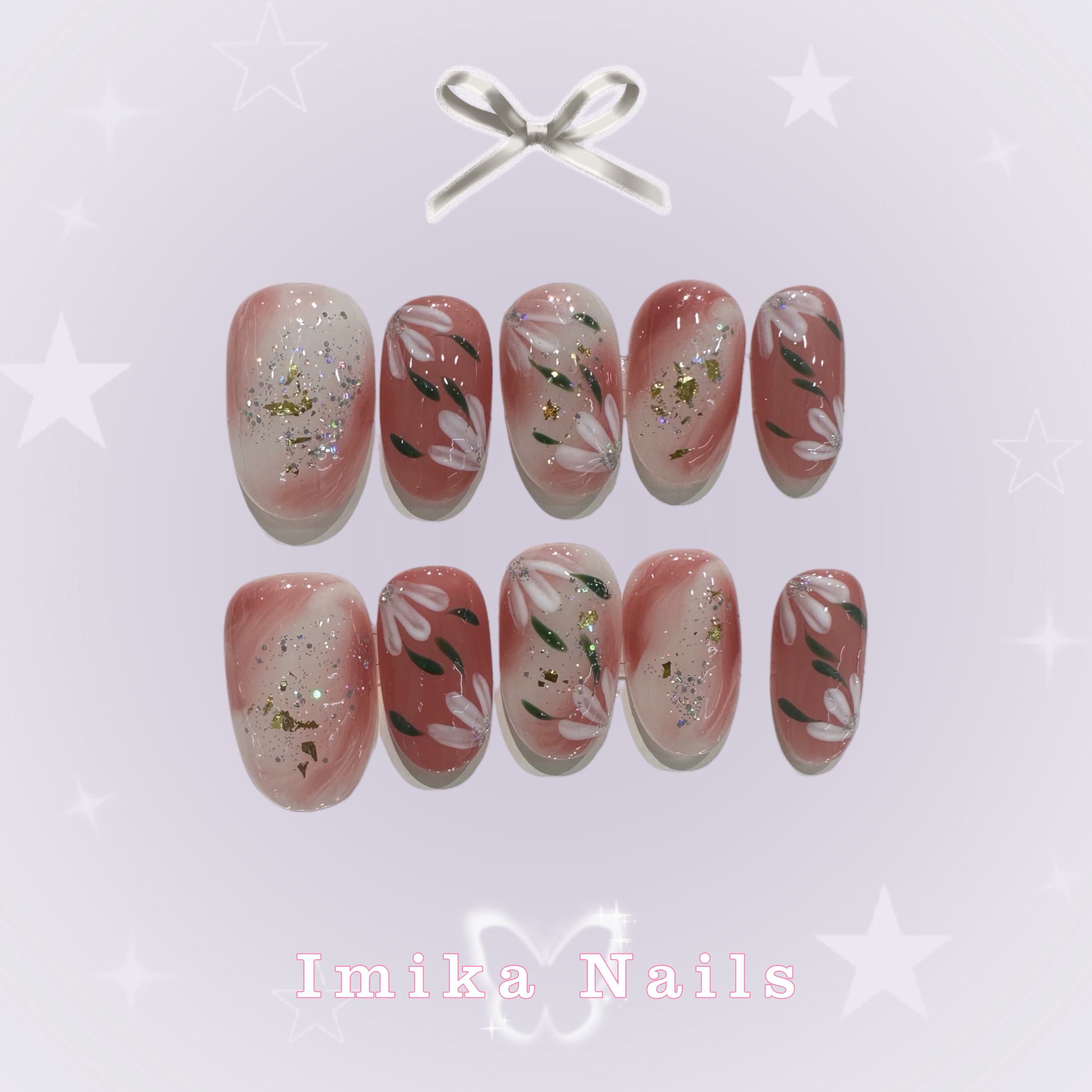 ピンクの透過グラデーションをベースに、手描きの白い花、緑の葉、金箔片、細かいラメをアクセント。優しく清々しい雰囲気を纏い、XS/S/M サイズ対応で春夏コーデに最適です。