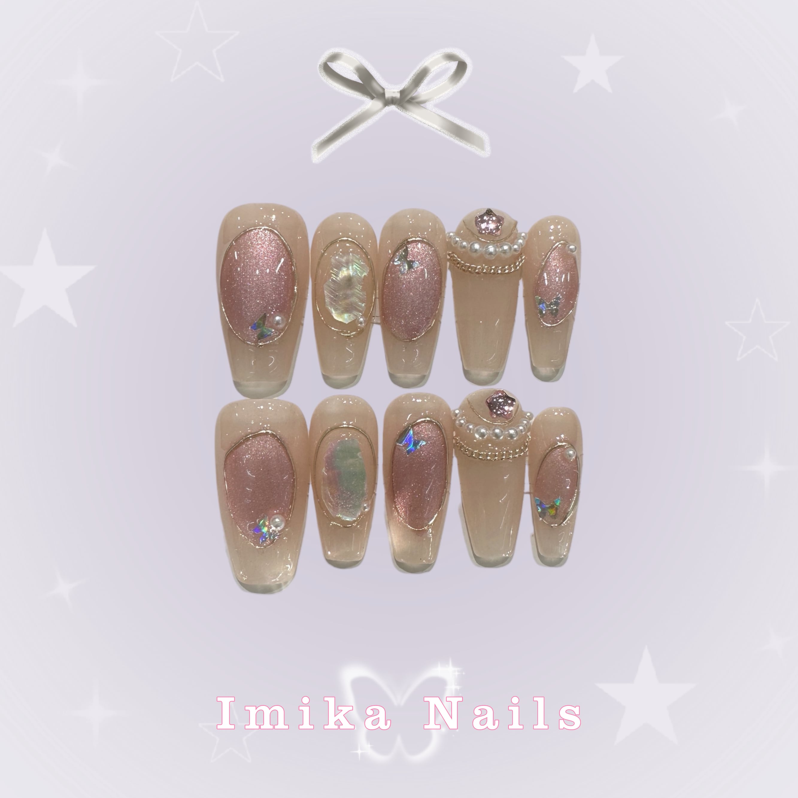 ピンクの透過グラデーションをベースに、ゴールドのライン、ピンクのストーン、パール、幻彩片をアクセント。優しく高級感あふれる雰囲気を纏い、XS/S/M サイズ対応でデートや日常使いに最適です。